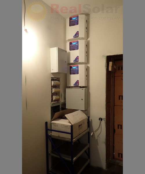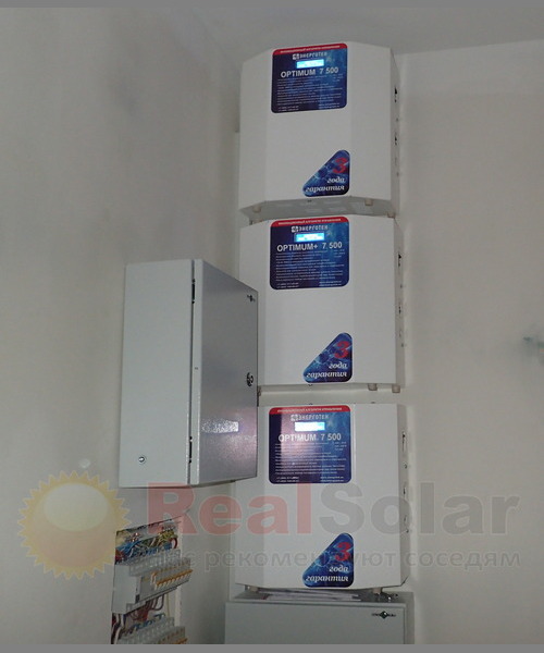 Для обеспечения резервного электропитания частного дома была установлена инверторная система со стабилизаторами напряжения. Еще на этапе стройки выявились сильные просадки напряжения - до 170 вольт, и инженерами компании Энерготех-СПб были смонтированы три высокоточных стабилизатора Энерготех OPTIMUM 7500.