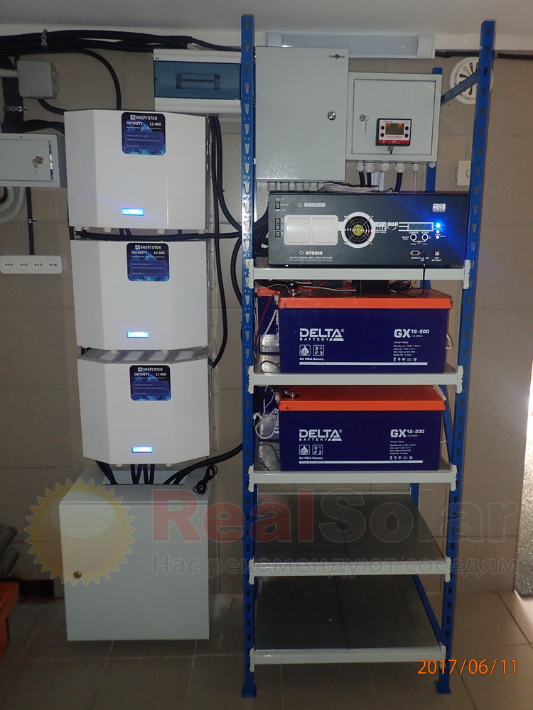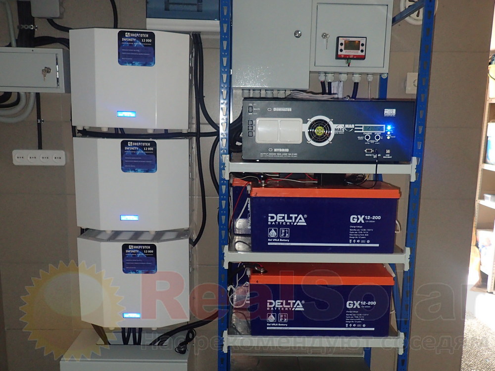 Для обеспечения резервного электропитания частного дома была установлена инверторная система со стабилизаторами напряжения. Еще на этапе стройки выявились сильные просадки напряжения - до 170 вольт, и инженерами компании Энерготех-СПб были смонтированы три высокоточных стабилизатора INFINITY 12000