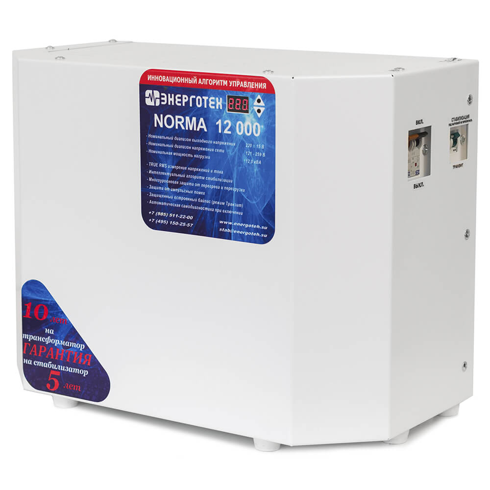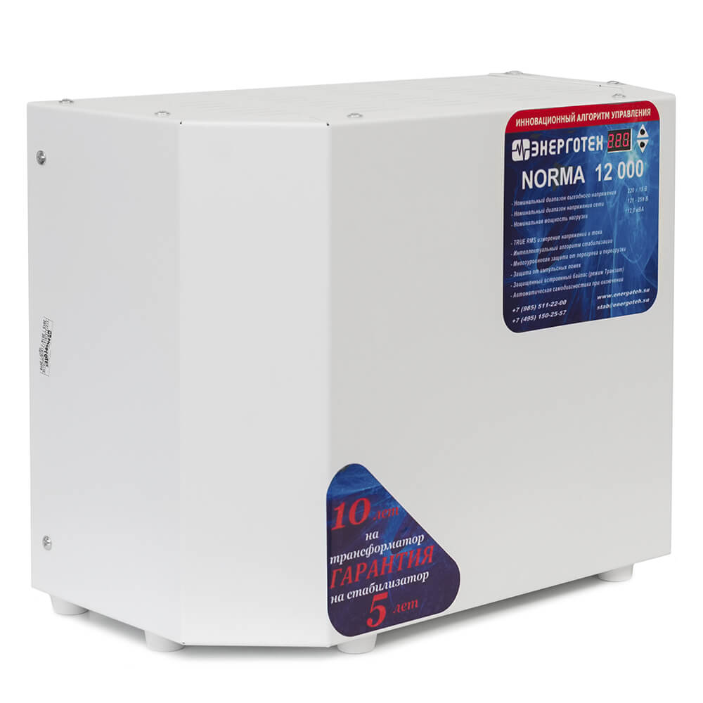 Однофазный стабилизатор переменного напряжения Энерготех NORMA 12000 предназначен для надежной защиты подключенного к стабилизатору электрооборудования пользователя от искажений и/или перепадов сетевого напряжения. Обеспечивает стабильную и безотказную работу домашней аппаратуры и электроприборов.