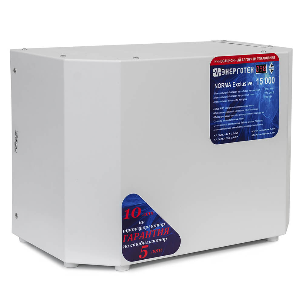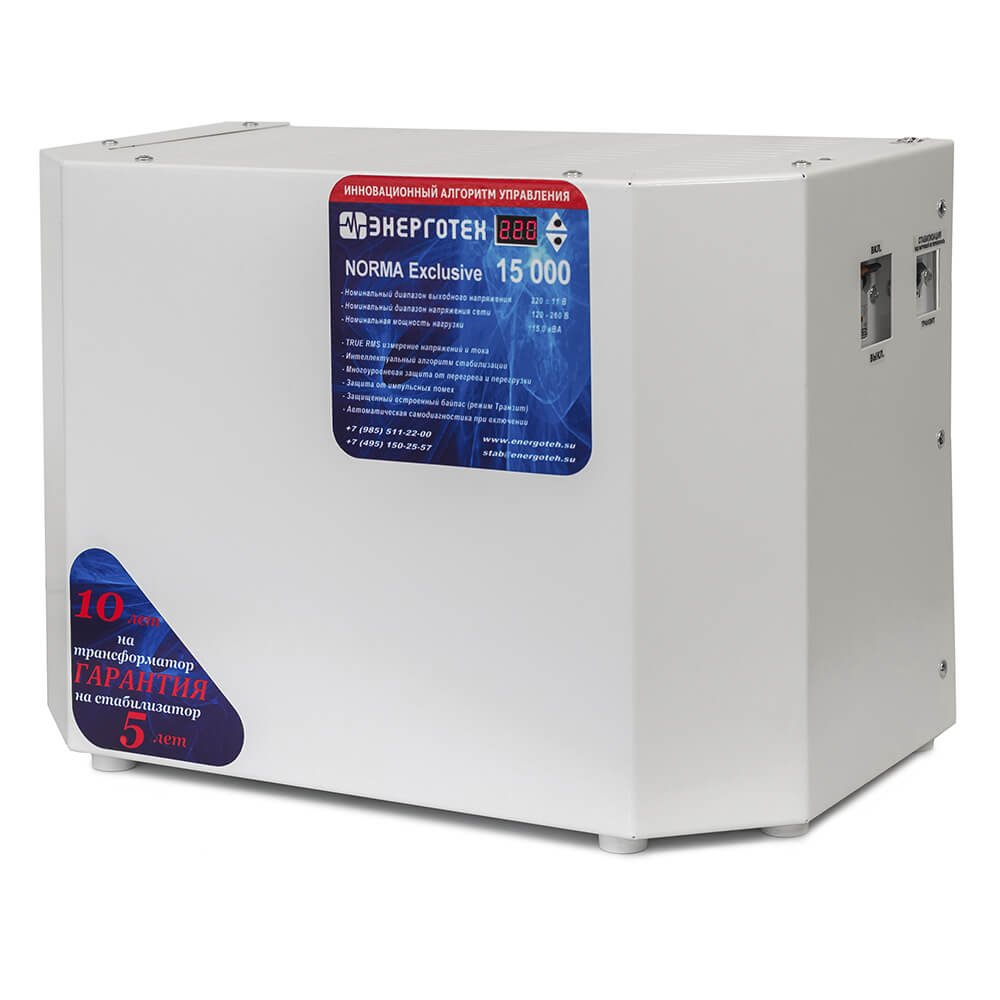 Однофазный стабилизатор переменного напряжения Энерготех NORMA Exclusive 15000 надежно защитит электрооборудование от перепадов напряжения, обеспечит стабильную и безотказную работу электроприборов на протяжении всего срока эксплуатации.