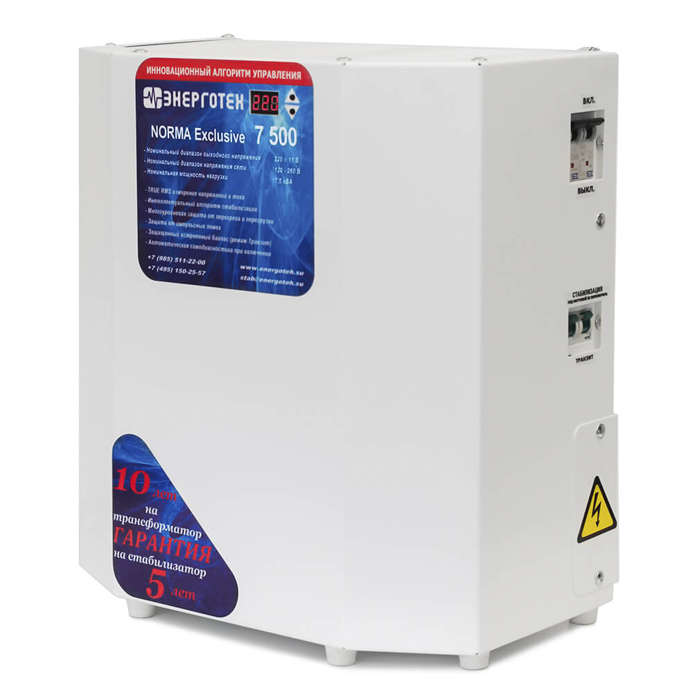 Однофазный стабилизатор переменного напряжения Энерготех NORMA Exclusive 7500 надежно защитит электрооборудование от перепадов напряжения, обеспечит стабильную и безотказную работу электроприборов на протяжении всего срока эксплуатации.