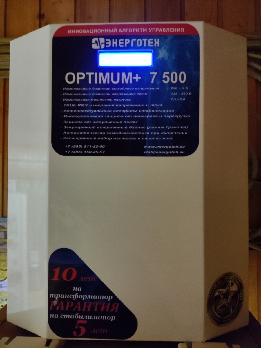 стабилизатор энерготехОднофазный стабилизатор переменного напряжения Энерготех OPTIMUM 7500 предназначен для надежной защиты подключенного к стабилизатору электрооборудования пользователя от искажений и/или перепадов сетевого напряжения. Обеспечивает стабильную и безотказную работу домашней аппаратуры и электроприборов.