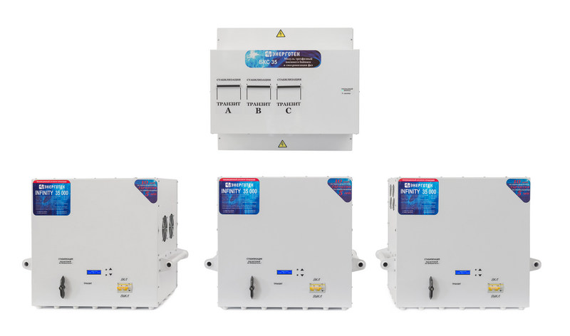 Трехфазный стабилизатор переменного напряжения Энерготех INFINITY 35000х3 технически выполнен из трех однофазных стабилизаторов Энерготех INFINITY 35000, объединенных блоком БКС.