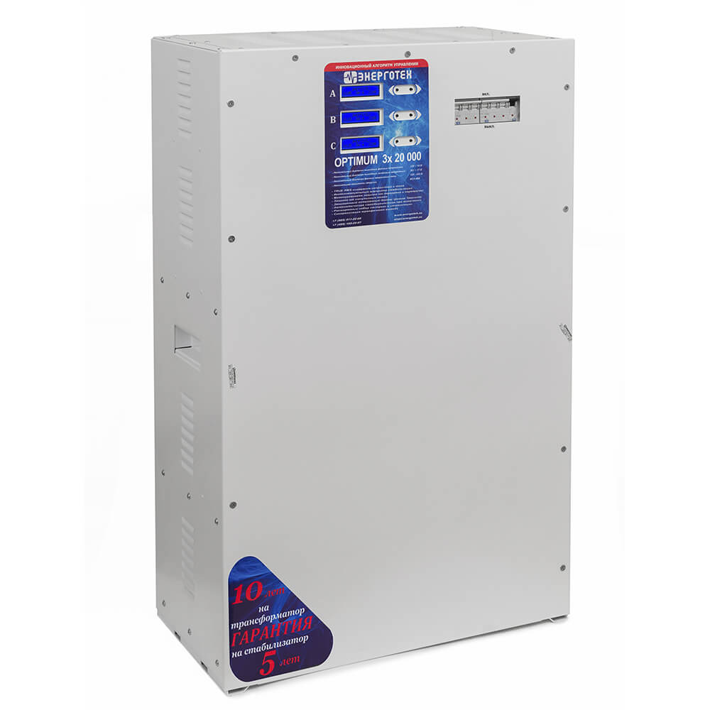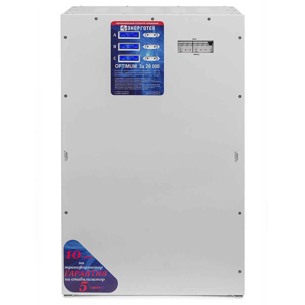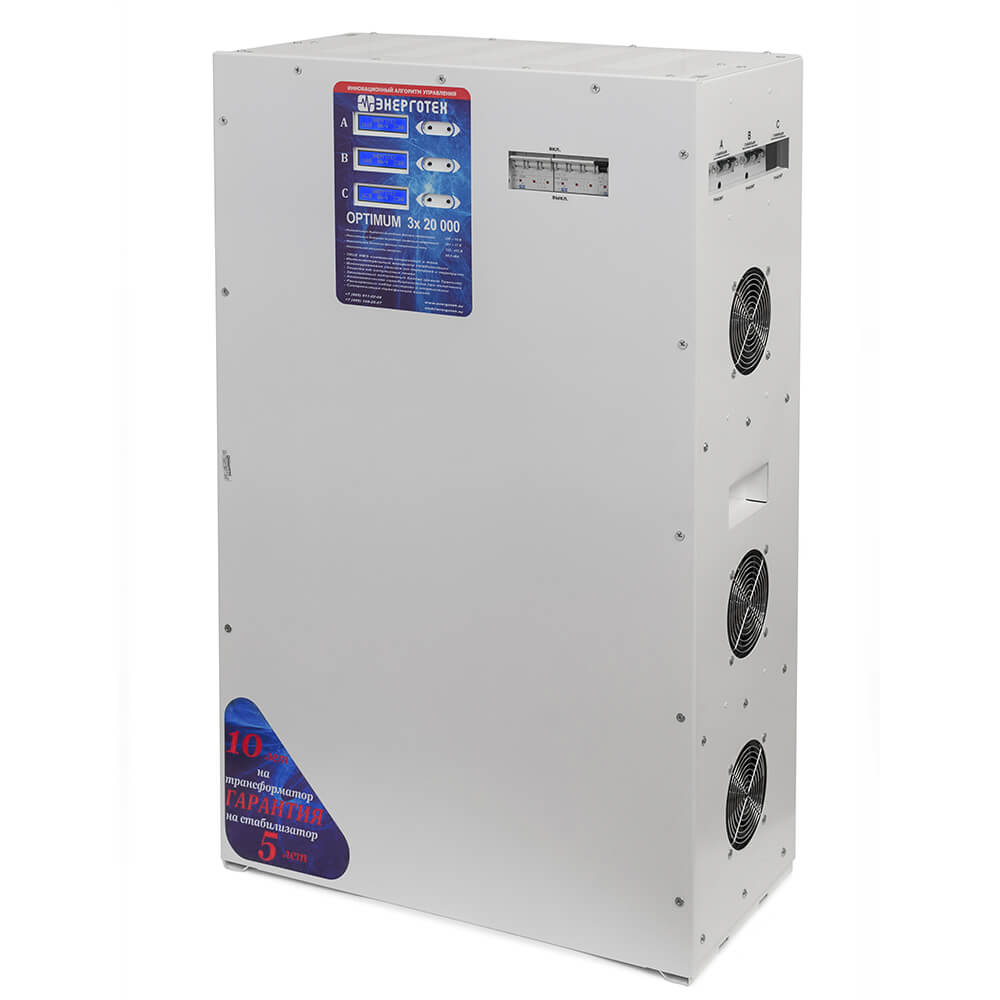 Трехфазный стабилизатор напряжения Энерготех OPTIMUM 20000х3 (HV) рекомендован для нагрузки до 20 кВт на фазу (до 60 кВт по трем фазам). Трехфазный стабилизатор построен на основе трех однофазных модулей, соединенных по схеме "звезда" с обязательной входной нейтралью.