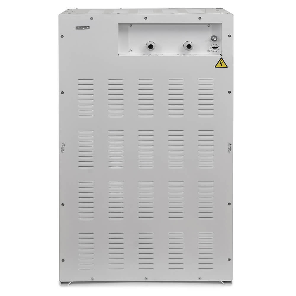 Основой тиристорного стабилизатора являются автотрансформаторы с 12 ступенями стабилизации каждый, которые коммутируют высокоскоростные тиристоры. Благодаря использованию электронных компонентов достигается надежность и высокая скорость реакции на колебания сети. Дополнительным плюсом является наличие режима "ручной байпас", который используется при аварийных или ремонтных работах.