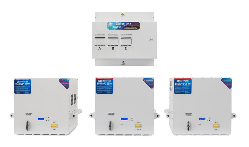 Трехфазный стабилизатор переменного напряжения Энерготех STANDARD 35000х3 (HV) технически выполнен из трех однофазных стабилизаторов Энерготех 35000х3 (HV).